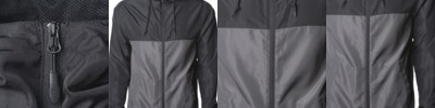 - Raw-edge hood opening, pocket seams, cuffs, waistband, zipper placket and side seams