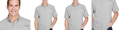 3.8 oz., 100% cotton poplin; Self-adhesive collar points; Vented; Utility loop; Columbia PFG logo patch on rod holder on left chest; PFG logo patch on center back.