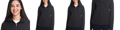 100% polyester, all season soft shell; Wind resistant; Water resistant, DWR finish; Breathable; Thumbhole cuff feature for secure fit ; Auto lock zipper with easy grab puller; Media port; 4-way stretch; Media port; Adjustable three-piece hood designed to contour for a comfortable fit; Zippered chest and hand pockets;