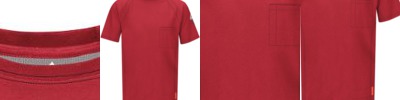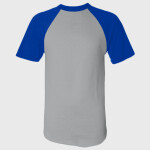 4.8 ounce 50% polyester/50% cotton jersey knit * Crew neck * Contrast color neck and sleeves * Raglan sleeves * Serged fishtail bottom