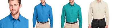 4.7 oz/yd2 / 158 gsm, 92% polyester, 8% spandex woven; Moisture-wicking performance; Spread collar with collar stand; Dyed-to-match pearlized buttons; Adjustable cuffs with button placket; Left-chest pocket; Side vents; Stretch performance; Active fit; Easy care;